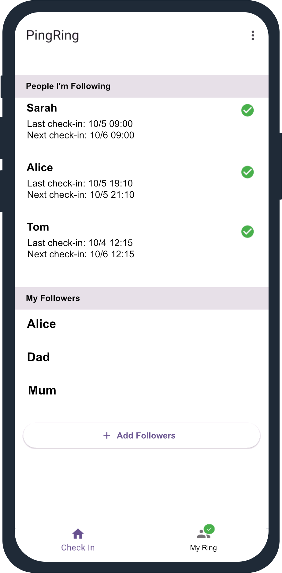 Morning coffee ritual? Evening dog walk? Set check-ins around your existing habits. One tap confirms you're going about your day, keeping your ring in the loop.