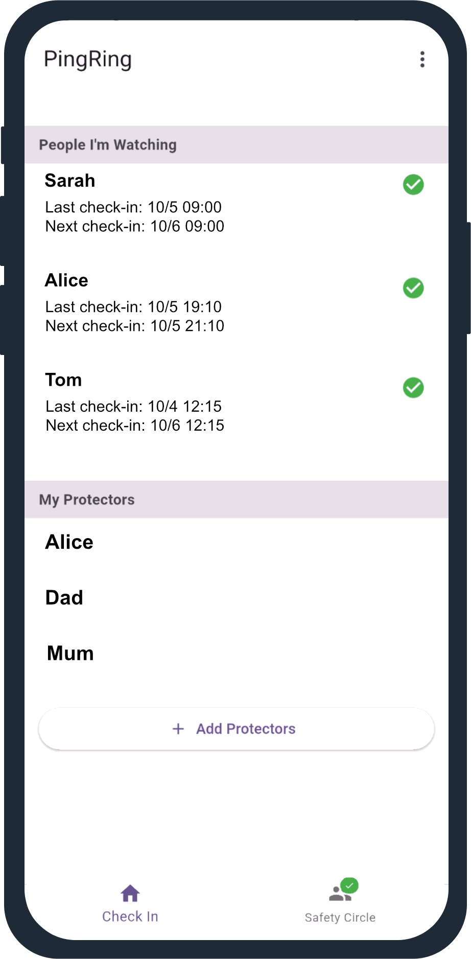 Whether it’s a daily morning hello or a check-in every few hours, PingRing fits your routine. One tap is all it takes to let your circle know you're fine.